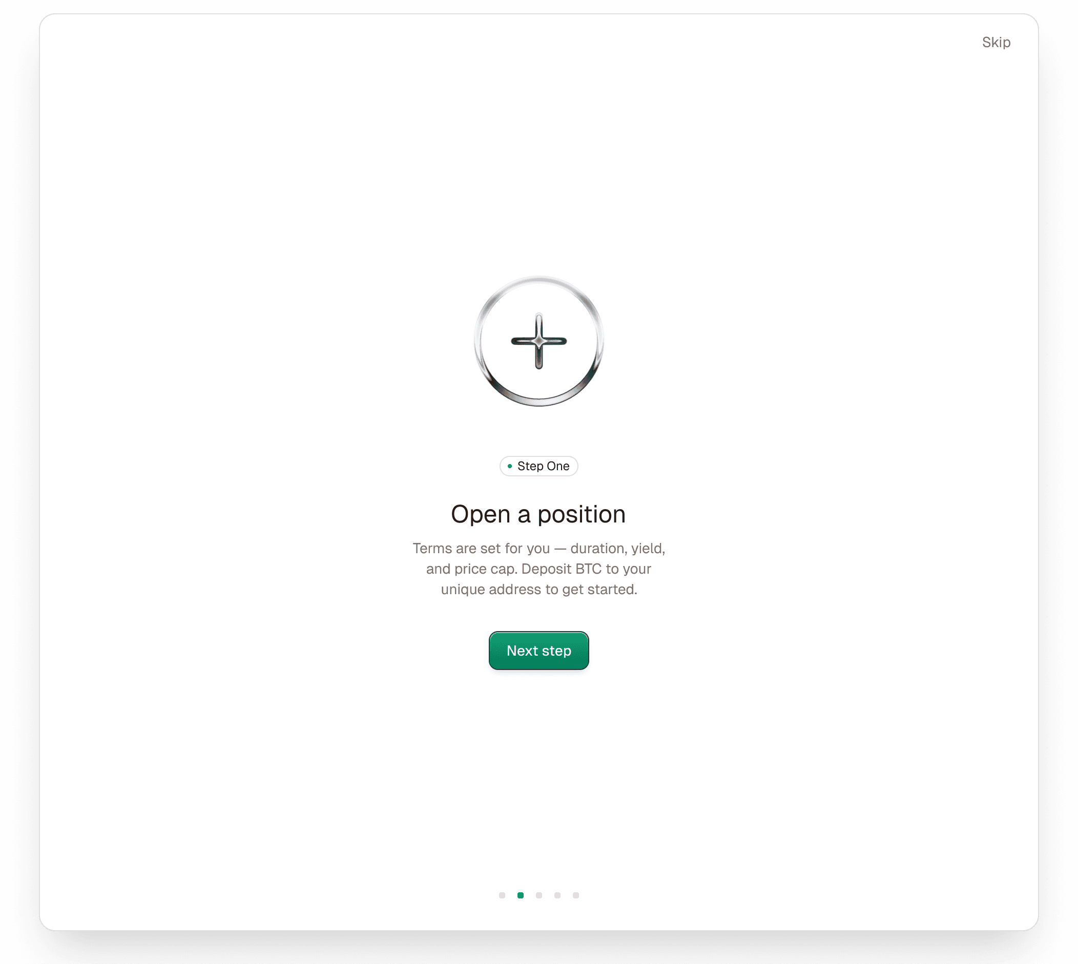 Choose your APY, set your price cap, and pick your maturity date. Open your position in minutes and let your Bitcoin work while you wait.