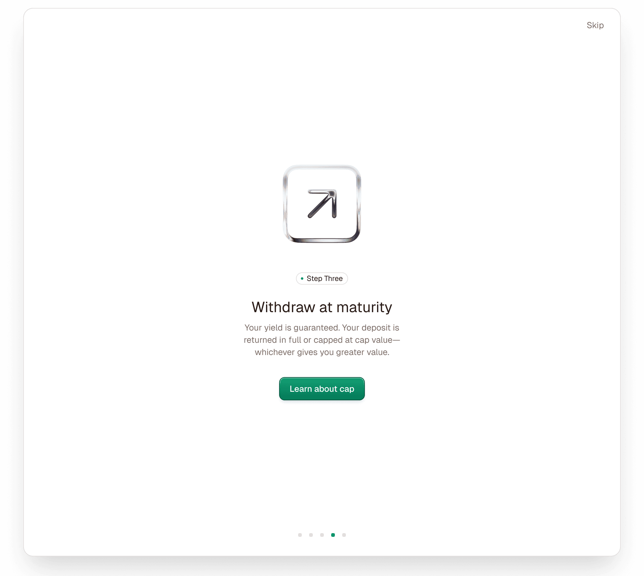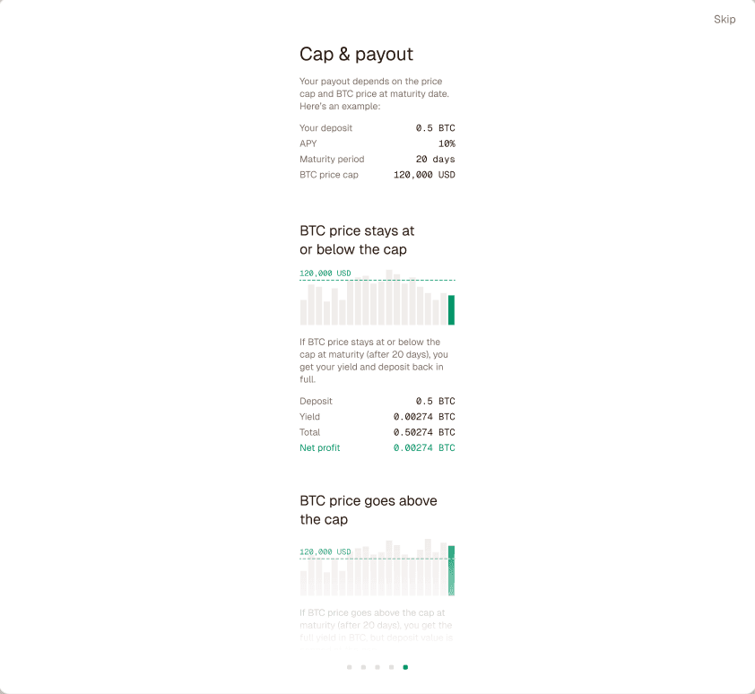 When you open a position, you agree to a BTC Price Cap alongside your chosen APY and maturity period. The cap reflects the level above which your deposit value is capped at maturity. Generally, setting a higher cap means accepting a lower yield, and a lower cap means earning more. Specific configuration options will be confirmed at launch.