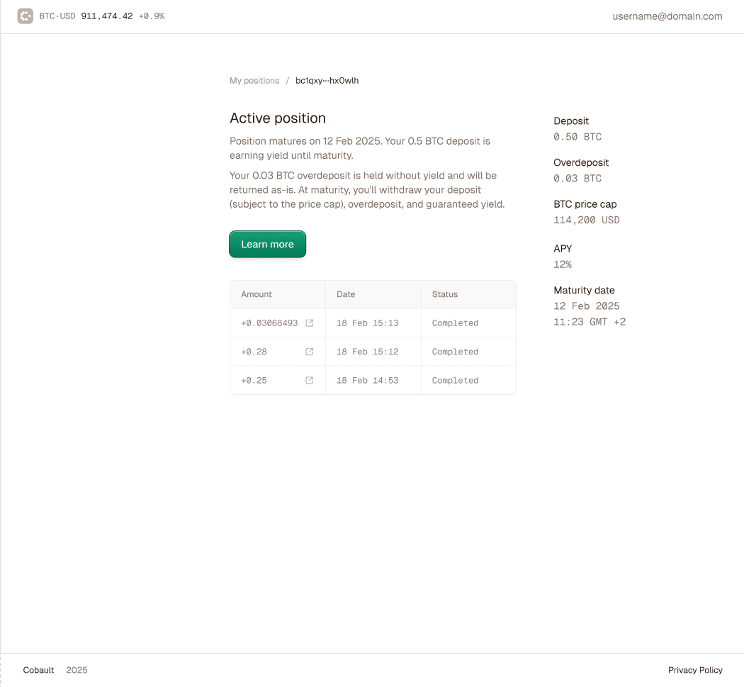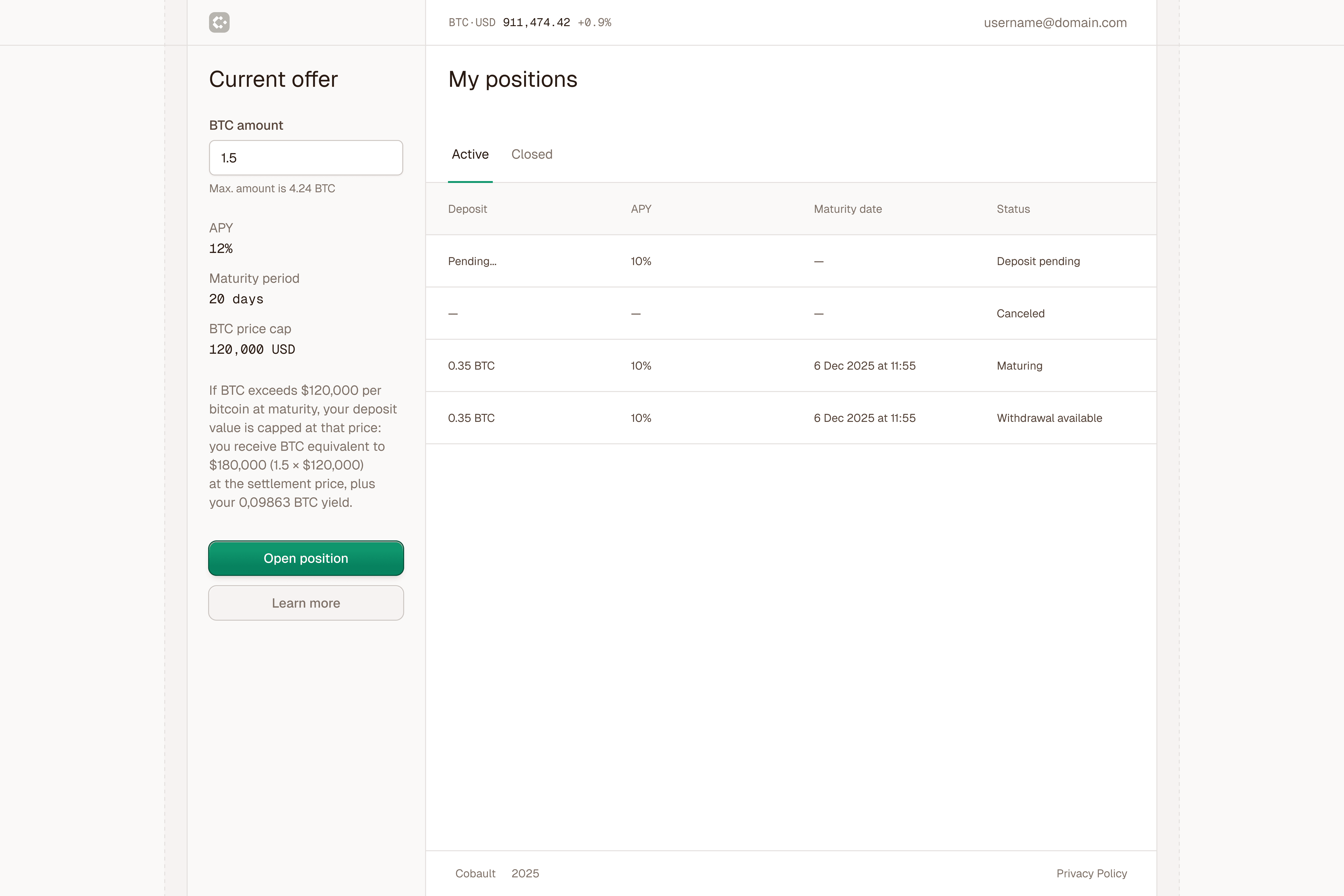 Your Bitcoin never leaves your control. While your position is open, your funds are held in a trustless multisig vault that requires your cryptographic signature to move. Cobault cannot access or move your Bitcoin unilaterally. Not under any circumstances, including if something were to happen to us as a company.